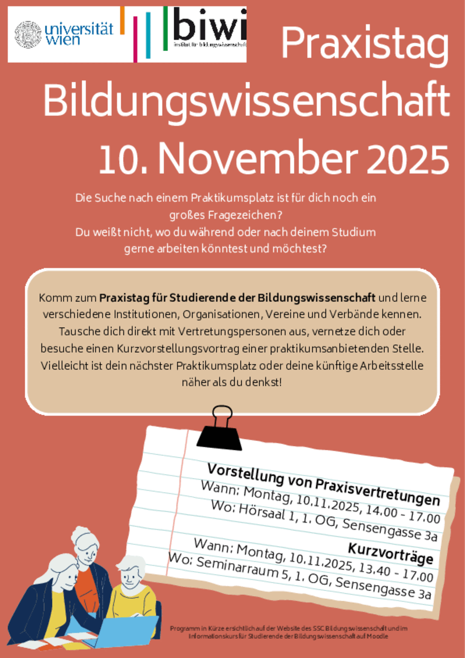 Im Zuge des Praxistages können Studierende im persönlichen Gespräch und im Zuge von Kurzvorträgen verschiedene praktikumsanbietende Institutionen und potenzielle Arbeitgeber:innen kennenlernen und so einen Einblick in mögliche Praktikumsplätze und Berufssparten erhalten.
